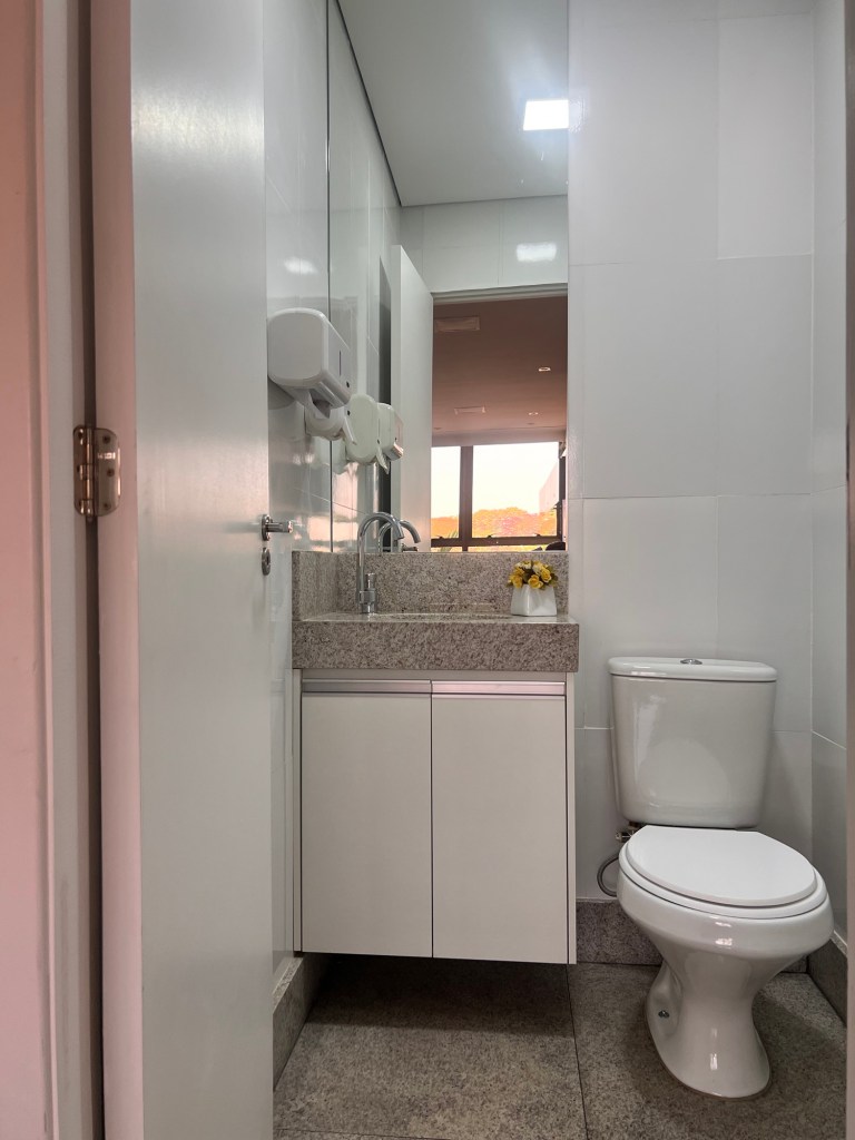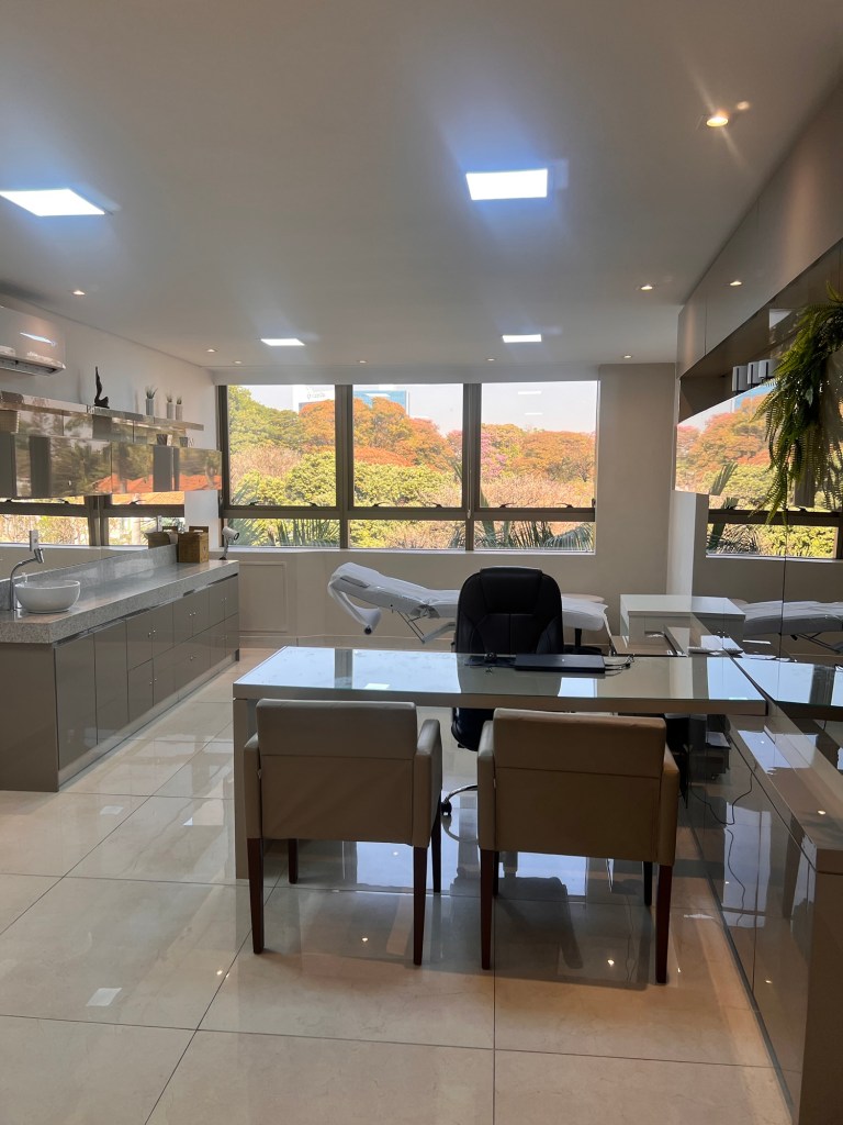 O consultório médico é amplo, moderno, possui maca elétrica, acabamento luxuoso e ambiente climatizado.